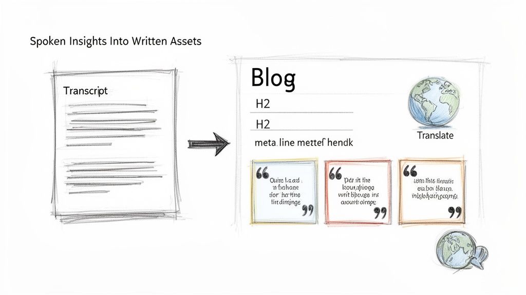 An accurate transcript is the blueprint for an authoritative blog post. Imagine taking the key themes from your webinar and, with a single click, generating a fully structured article complete with SEO-optimised H2 and H3 headings. This isn't just copy-pasting dialogue. It’s an intelligent transformation of a conversation into a well-organised, readable format that search engines love.